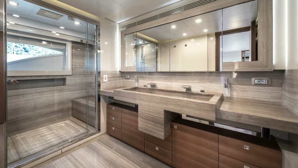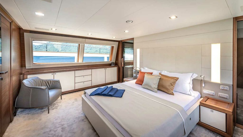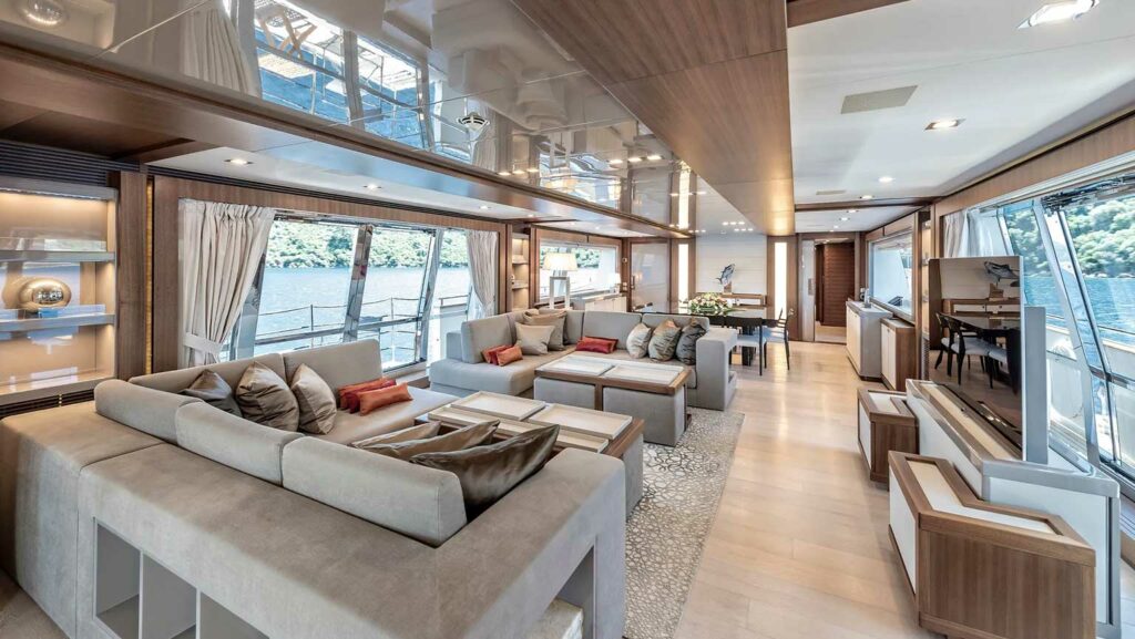 The main saloon is an open-concept communal living space. Satin-finished teak is found throughout the interior with natural earth tones and whitewashed large plank oak flooring. Sliding doors in the middle of the saloon to port and starboard open up, connecting to fold-down balconies giving a refreshing cross-breeze and al fresco feel to the entire space.